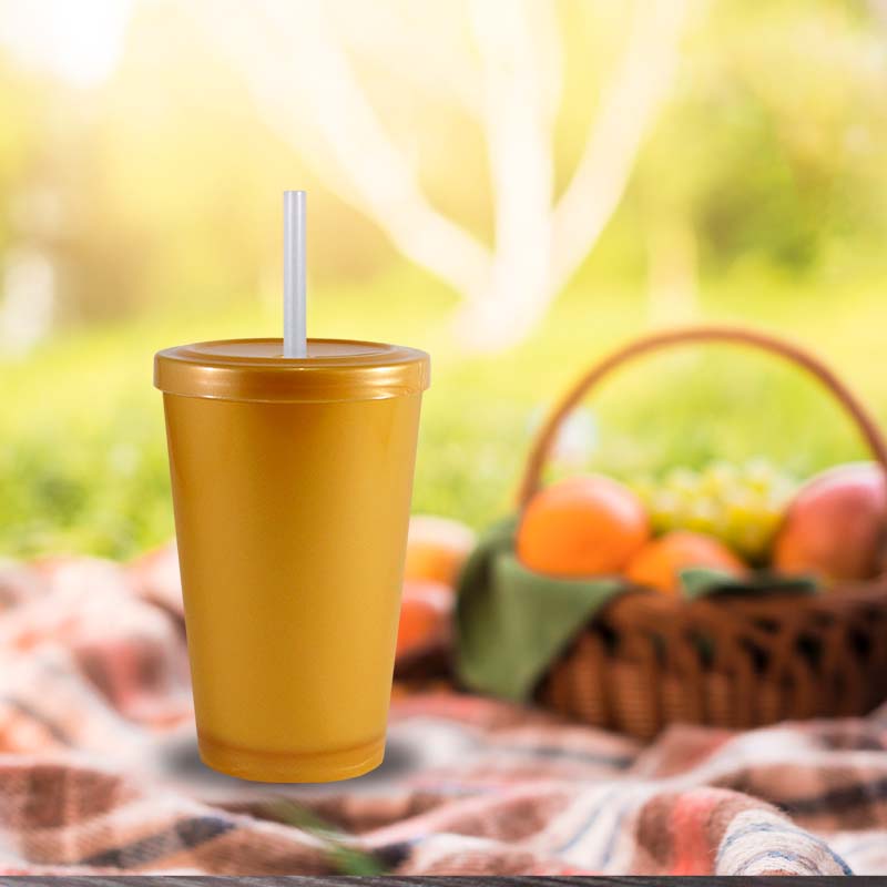 Kit 2 Copo Tampa Canudo Dourado 320mL Plástico Premium