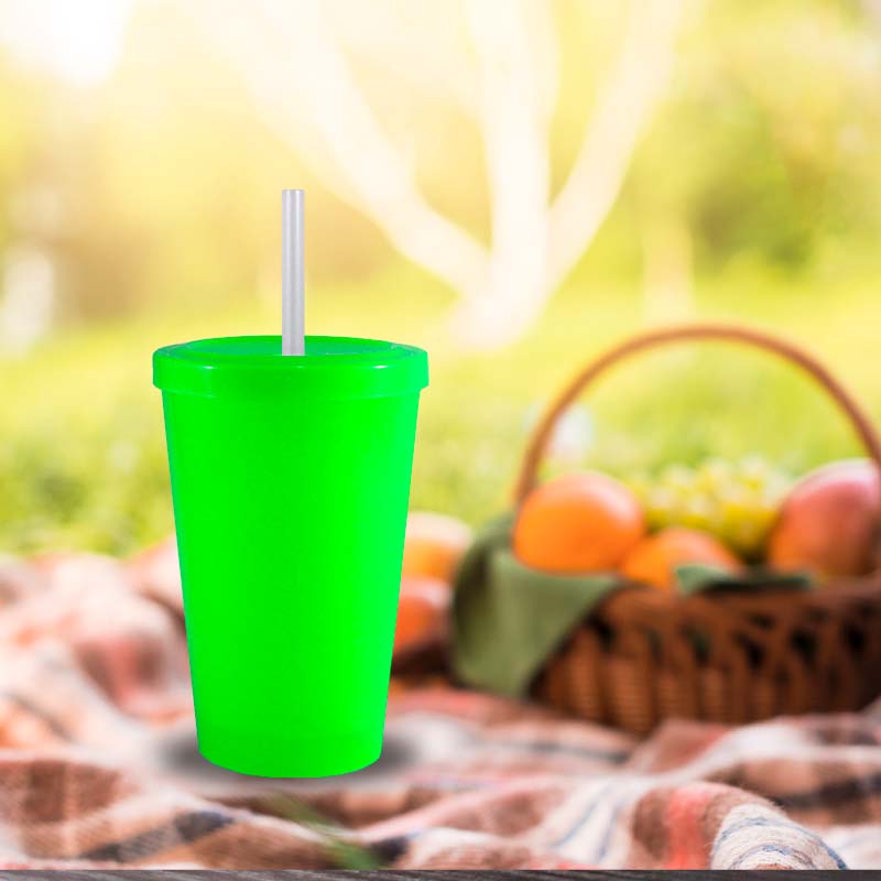 Kit 2 Copo Tampa Canudo Verde Neon 320mL Plástico Premium