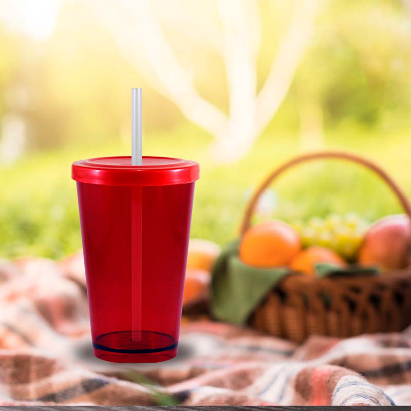 Kit 2 Copo Cristal Tampa Canudo Vermelho 320mL Plástico