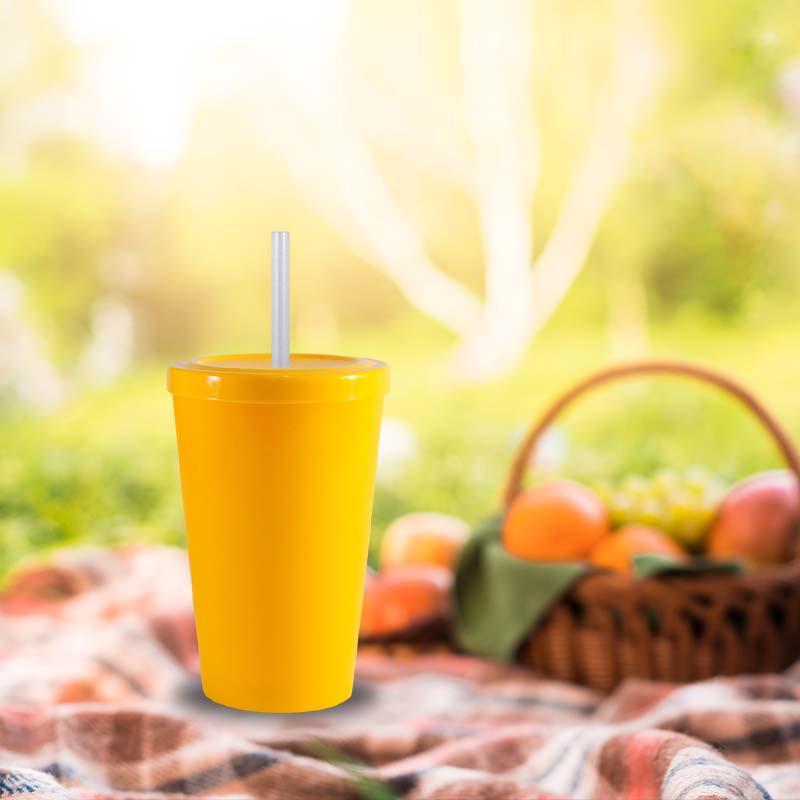 Kit 4 Copo Tampa Canudo Amarelo 320mL Plástico Premium