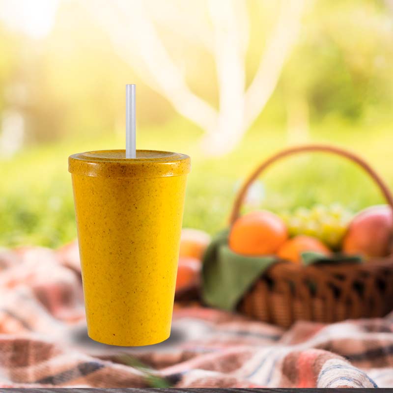 Kit 4 Copo Tampa Canudo Fibra Madeira Amarelo 320mL