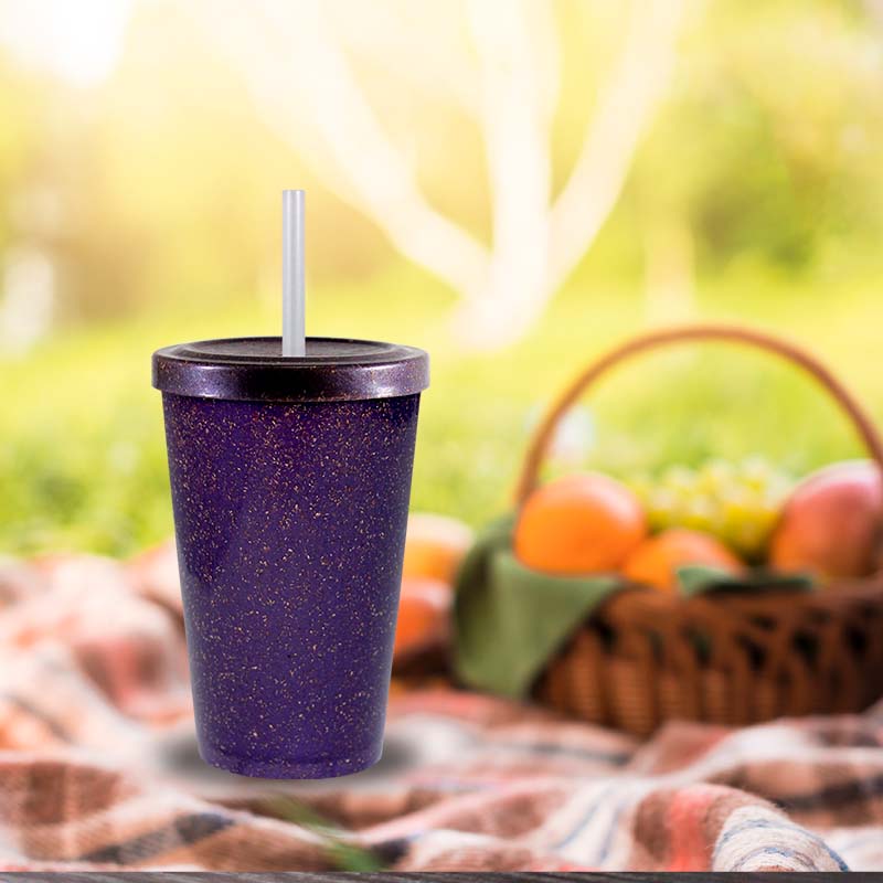 Kit 4 Copo Tampa Canudo Fibra Madeira Lilás 320mL