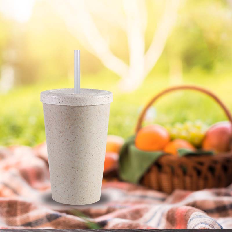 Kit 4 Copo Tampa Canudo Fibra Madeira Palha 320mL