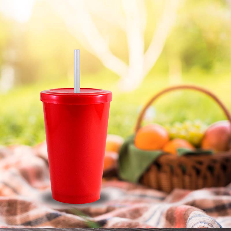Kit 4 Copo Tampa Canudo Vermelho 320mL Plástico Premium