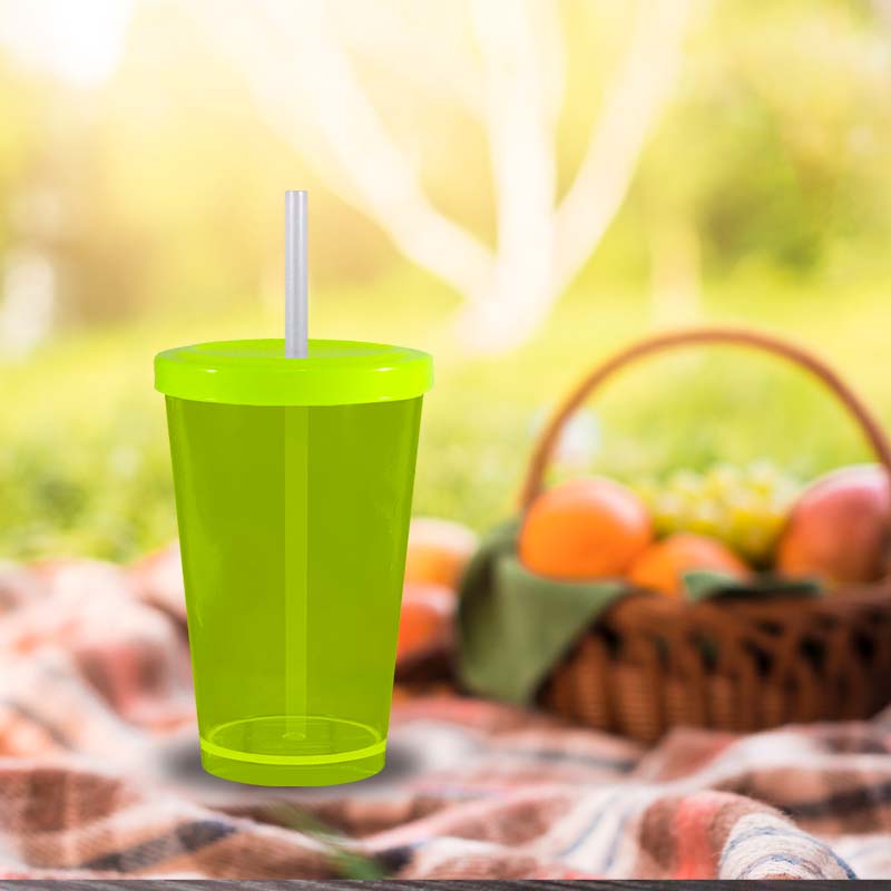 Kit 4 Copo Cristal Tampa Canudo Amarelo Neon 320mL Plástico