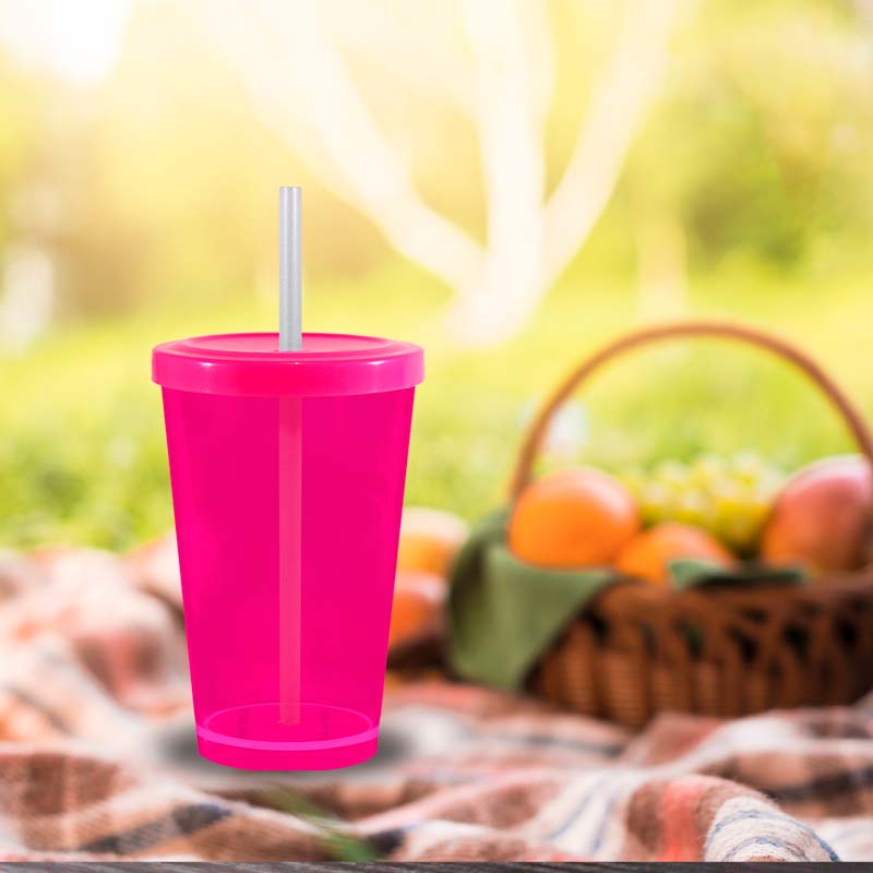 Kit 4 Copo Cristal Tampa Canudo Rosa Neon 320mL Plástico