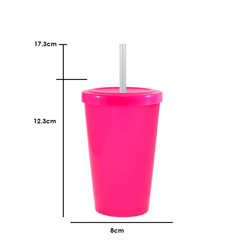 Kit 4 Copos Tampa Canudo 300mL Rosa Neon Colecao AMOR Completa
