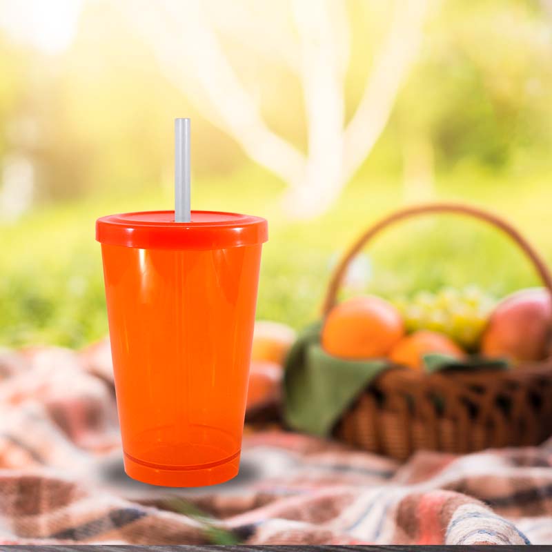 Kit 6 Copo Cristal Tampa Canudo Laranja Neon 320mL Plástico